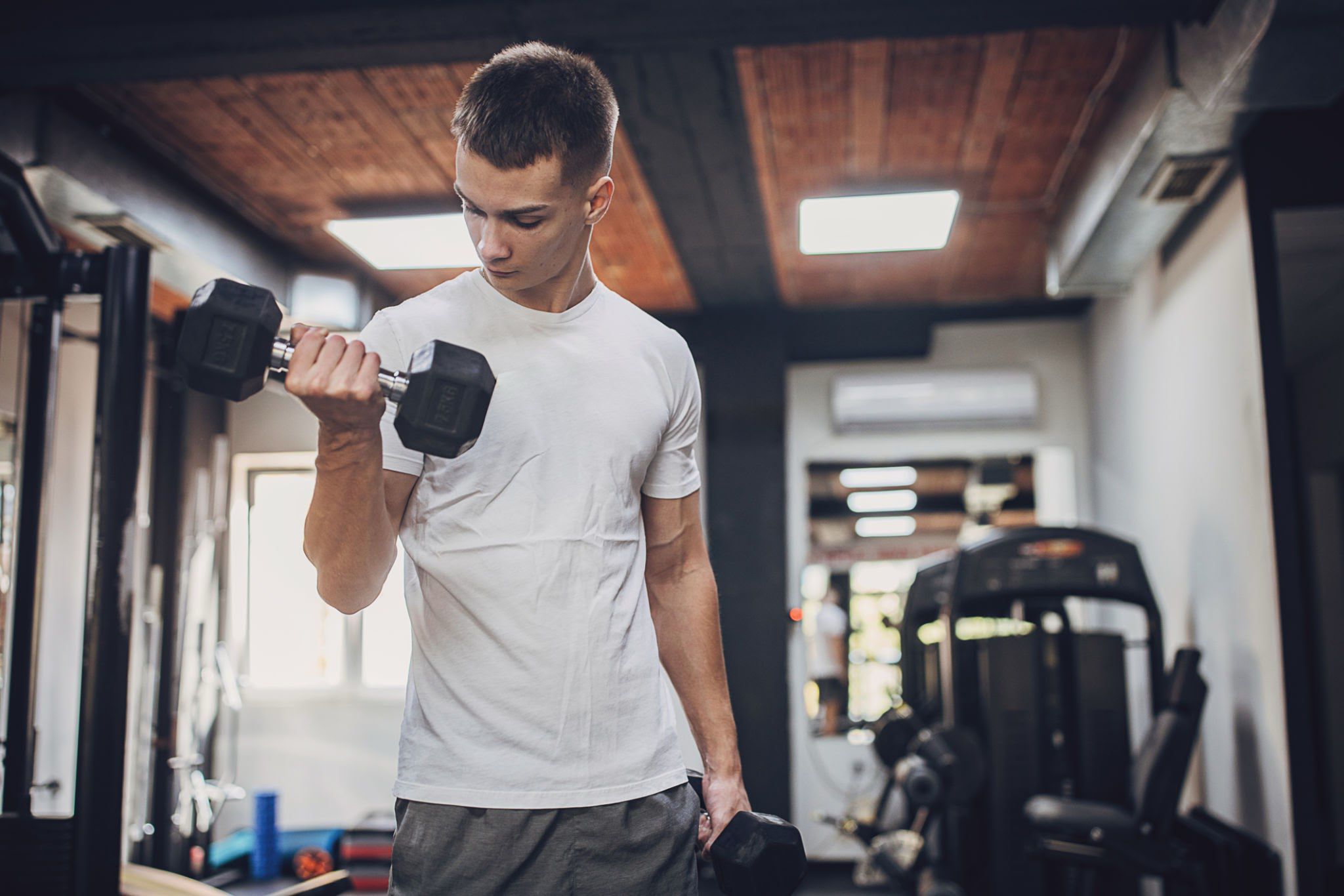 重いものを持とうとして体を揺らさないようにしましょう。「少し軽いかな?」と思うくらいの重量で、肘を脇に固定してゆっくりとダンベルを上下させるのが、力こぶを太くする最短ルートです。